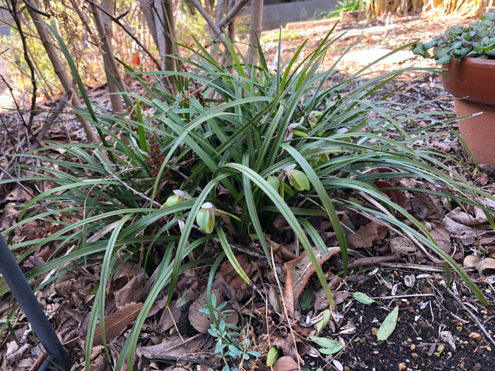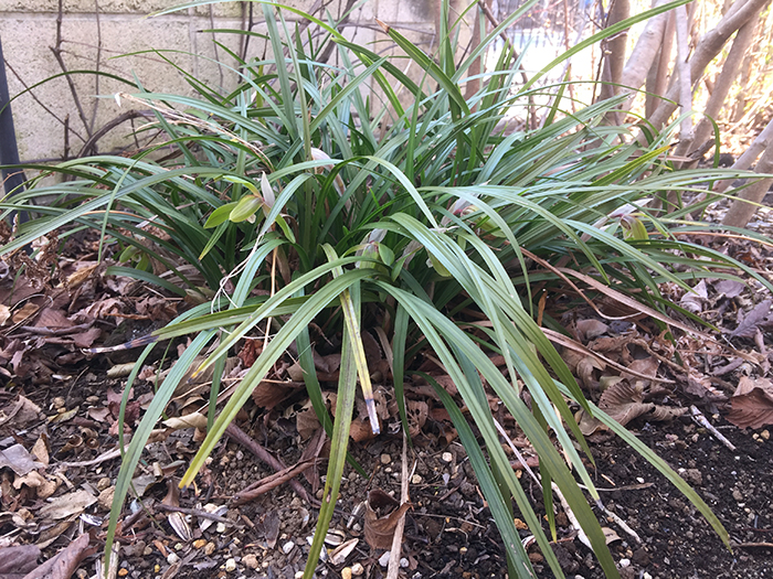 | 形態 | 葉は細長く、地際から叢生する。ごく細かい鋸歯があってざらつく。根は太くて長い。3~4月頃、根元から葉の陰に花茎を伸ばし、横向きに花を咲かせる。花茎は薄膜状の鱗片にゆるく包まれる。花は黄緑色~緑色。果実は紡錘形で、上向きに直立する。種子はきわめて小さい。 |