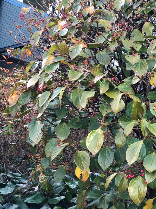 | 形態 | 樹皮は⿊褐⾊。若い枝は緑色で、次第に紫味を帯びる。葉は先が尖った菱状倒卵形~菱状卵形で、基部は楔形、濃緑色で光沢があり、浅い鋸歯があり、葉柄はやや長く、赤紫色味を帯び、対生する。3~5月頃、枝先に散形花序を作る。花は白色の5弁花で、5本の雄しべは花弁よりも短い。花には悪臭がある。果実は長球形の核果で10~12月頃に赤く熟す。葉は寒さで一部紅葉する。 |