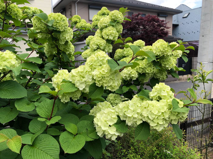 | 形態 | 幹は株立ちでよく分枝する。樹皮は灰褐色で、まばらに皮目がある。葉は先が尖った広倒卵形~広楕円形で、濃緑色で葉脈が目立ち、鈍い鋸歯があり、対生する。5~6月頃、枝先に散形花序を作る。花はすべてが装飾花で5弁で、花弁の大きさはすべて同じ。花色は咲き始めは薄緑色で、しだいに白くなる。果実はできない。 |