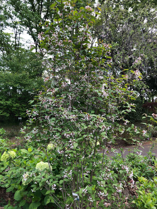 | 形態 | 幹は灰褐色。葉は先が尖った卵形~長卵形で、濃緑色で葉脈が目立ち、粗い鋸歯があり、対生する。4~5月頃、枝先に散房花序を作り、5~10個ほどの淡い紅色を帯びた白い花を垂らすように咲かせる。花冠は5中裂し、裂片の先端は丸い。果実は長球形の核果で、9~10月頃に赤く熟す。葉は、秋には赤く色づき、また、枯れたり傷ついたりすると、黒く変色する。 |